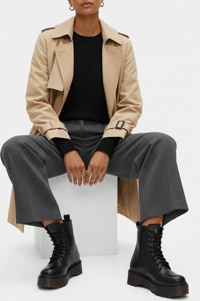 Skinny jeans hug the body and create an edgy contrast with the volume added by the boots. This combination is ideal for everyday activities, like a city stroll or a casual outing.