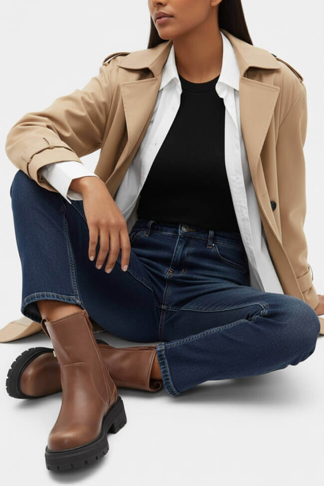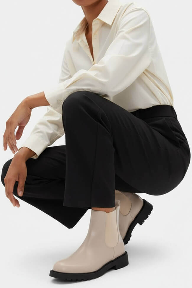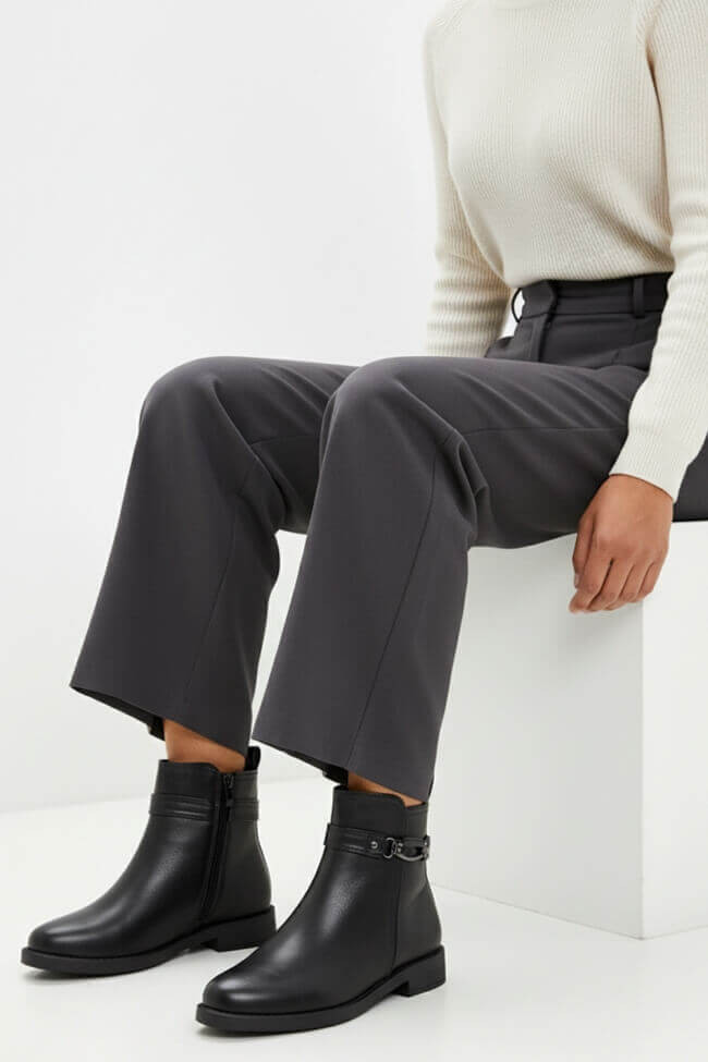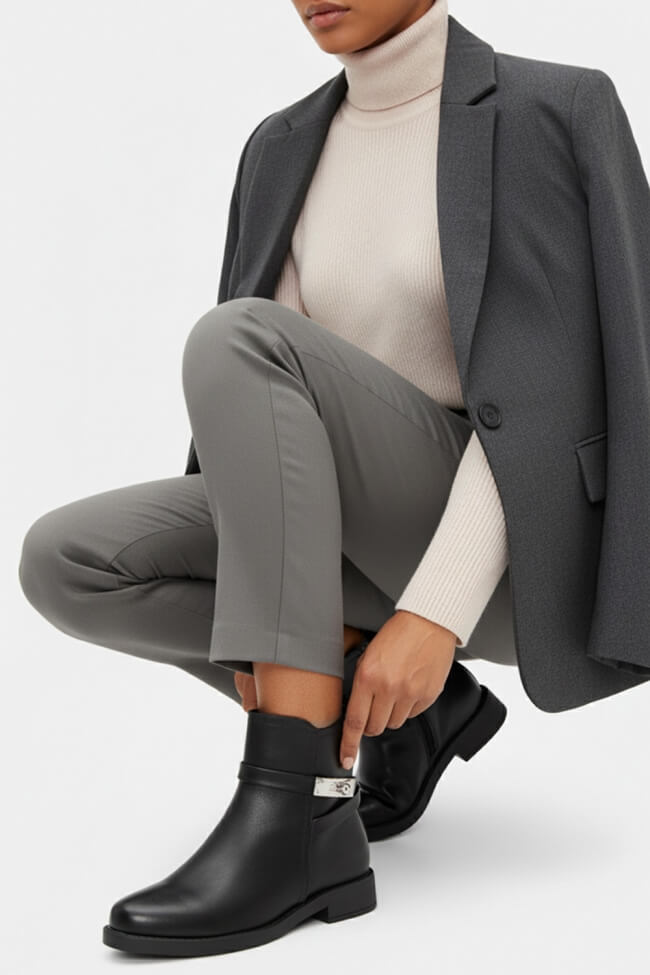 - Για Office Looks: Κάνε τα φλατ μποτάκια το go-to κομμάτι του γραφείου, φορώντας τα με κομψά παντελόνια ή tailored suits. Ένα ουδέτερο χρώμα μποτάκι θα δώσει μια επαγγελματική νότα στο look.