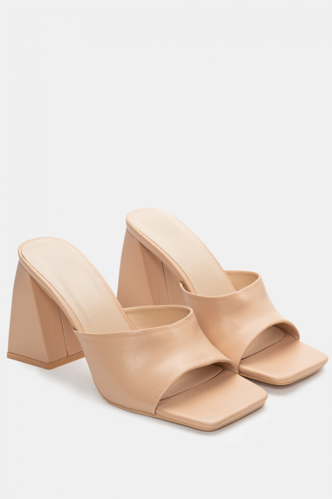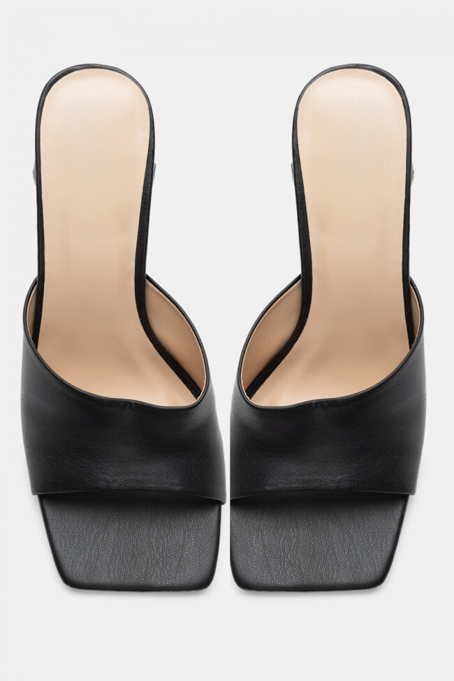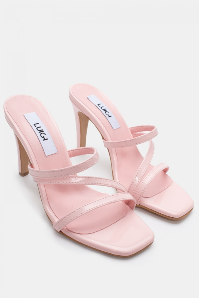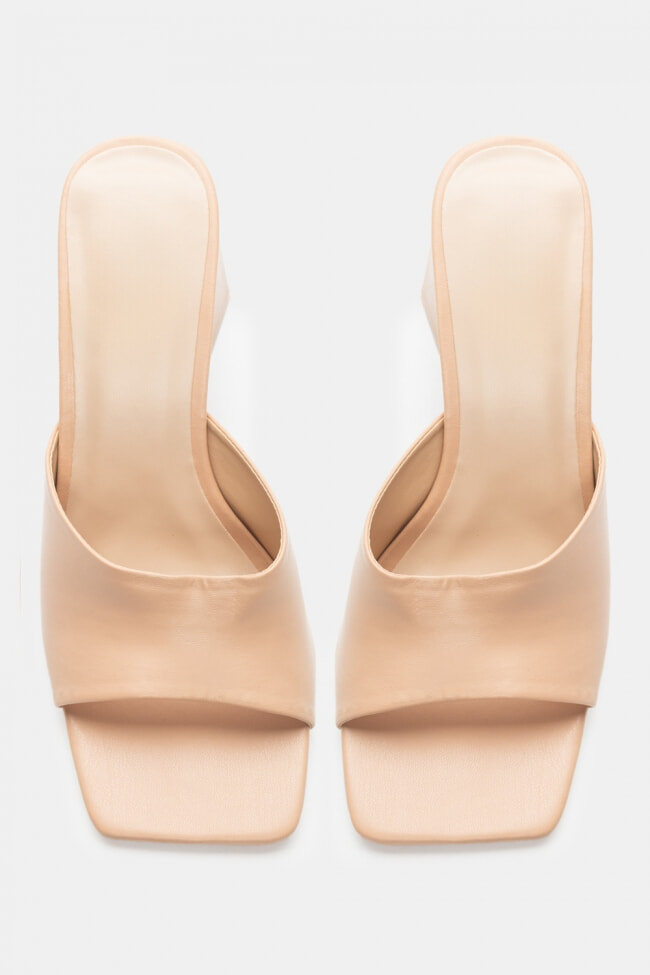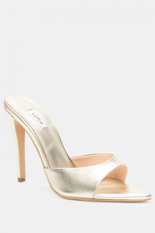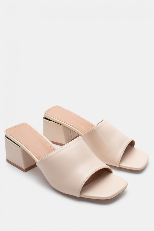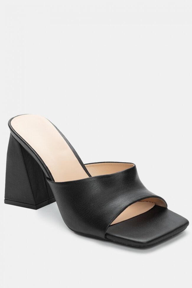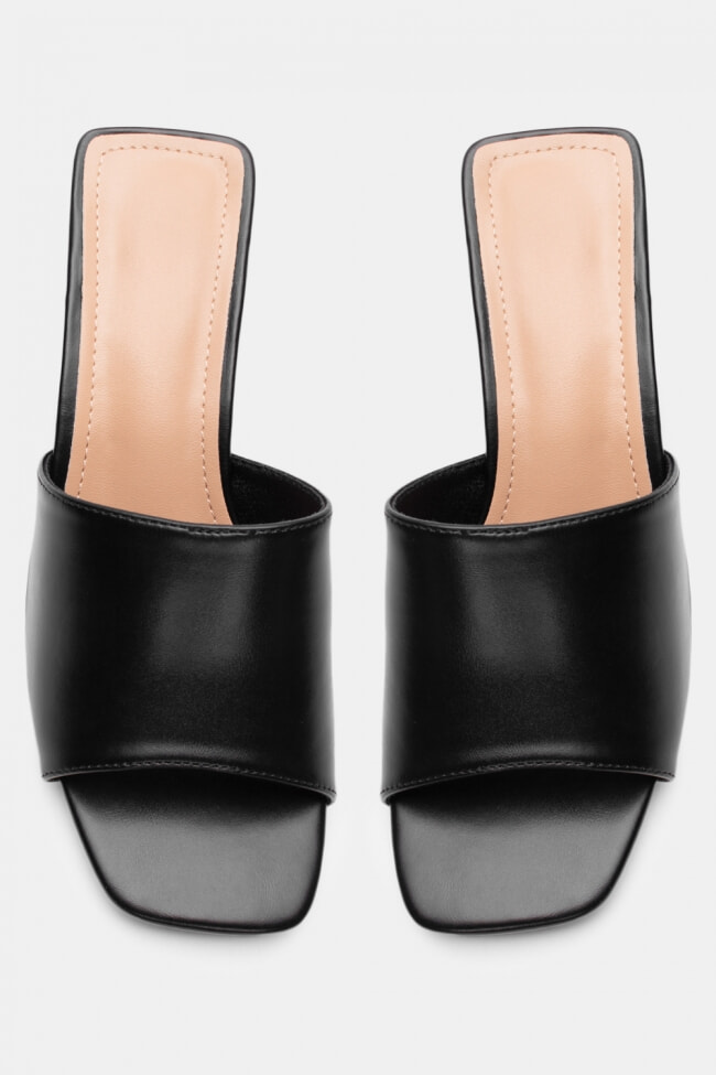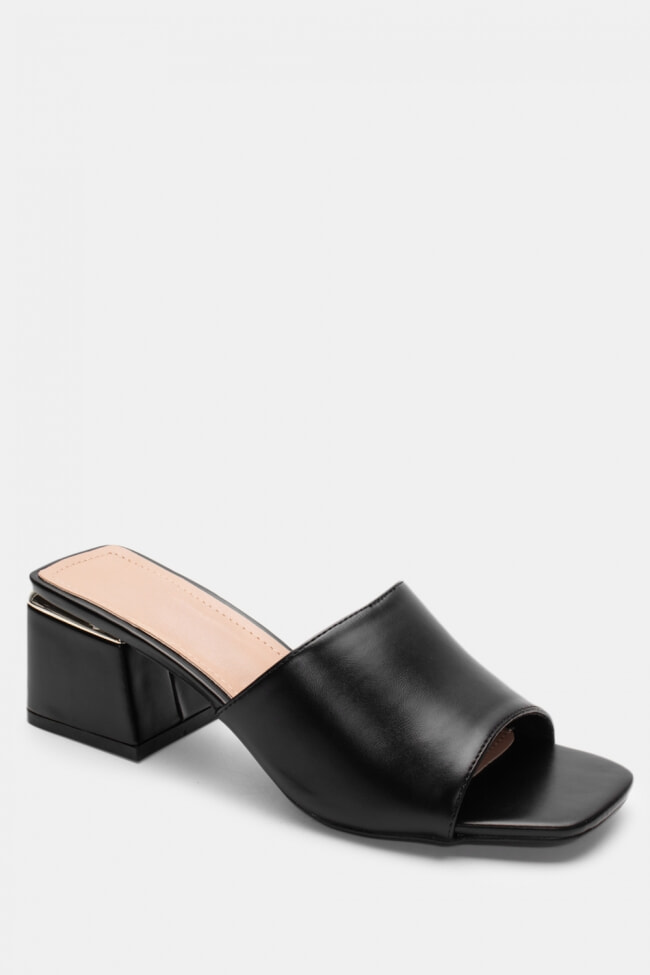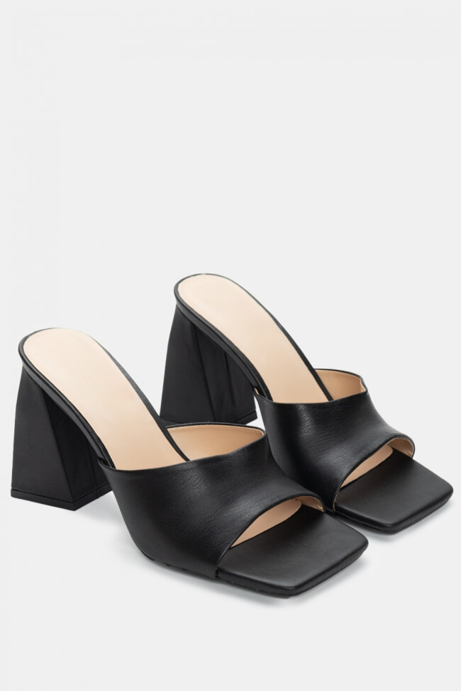 - Choose high mules satin or leather with strappy details for sleek & feminine results.